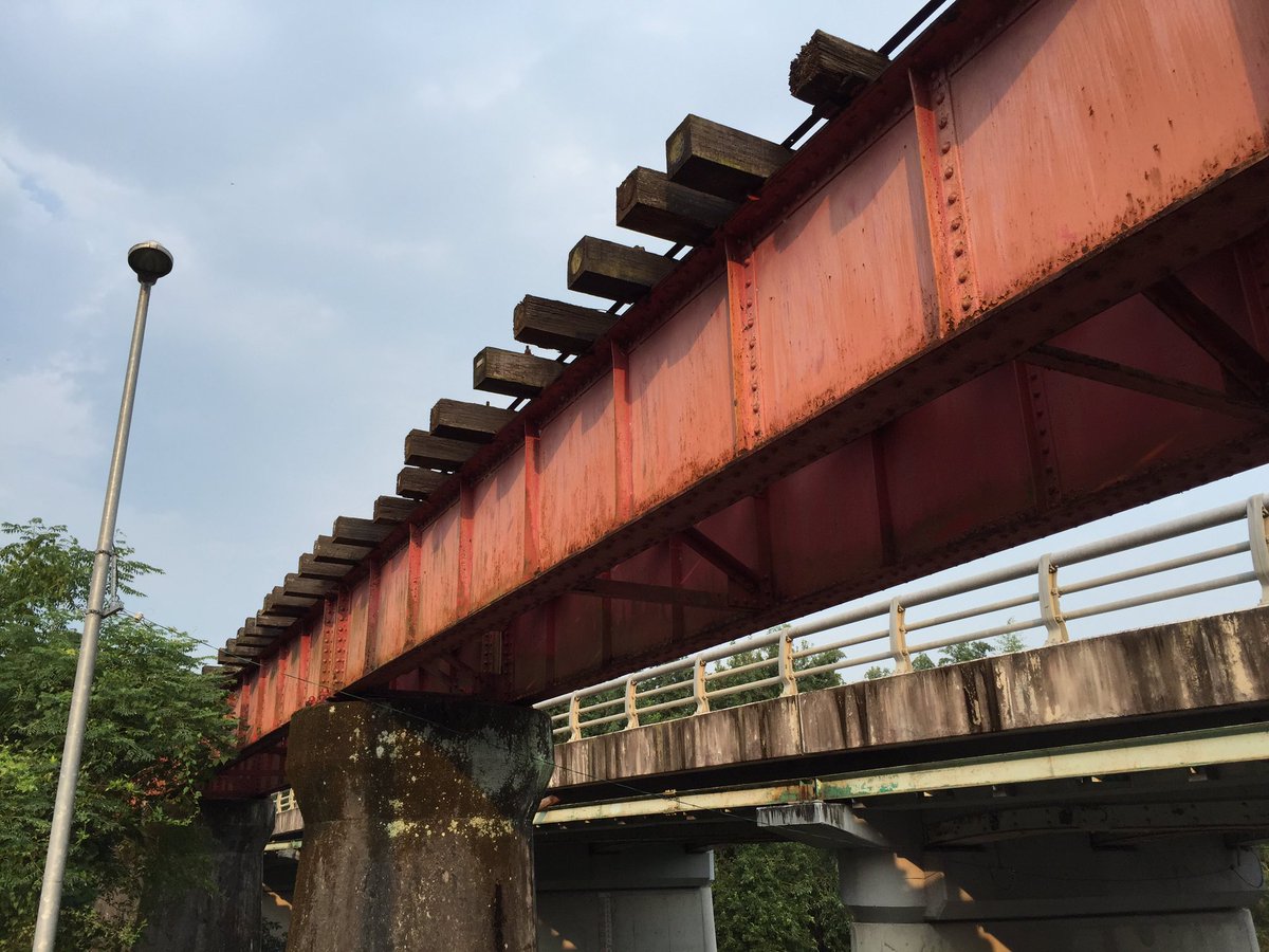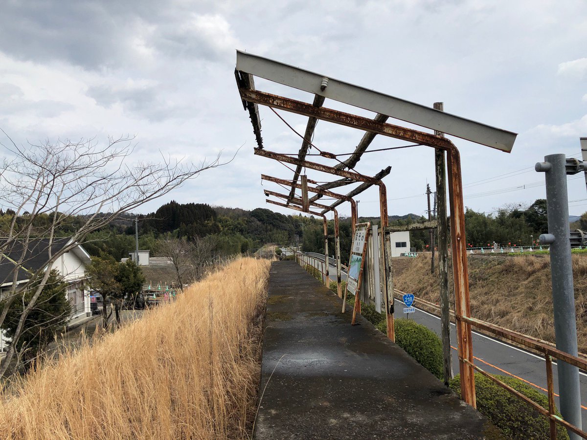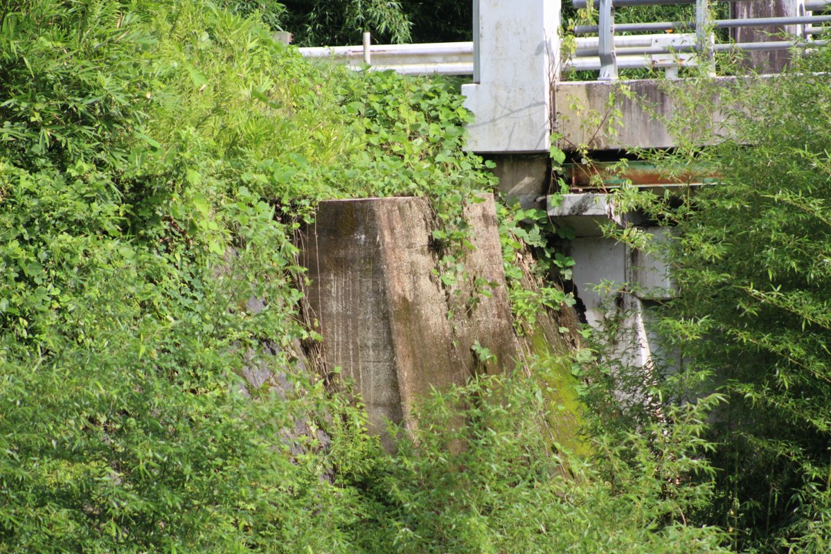 細見駅跡の少し先(延岡方)に立入禁止のバリケードがあり、その向こうを覗くと橋梁とレールが残存してました。帰りのバスが横の道を通り、バスからも見ることができました。