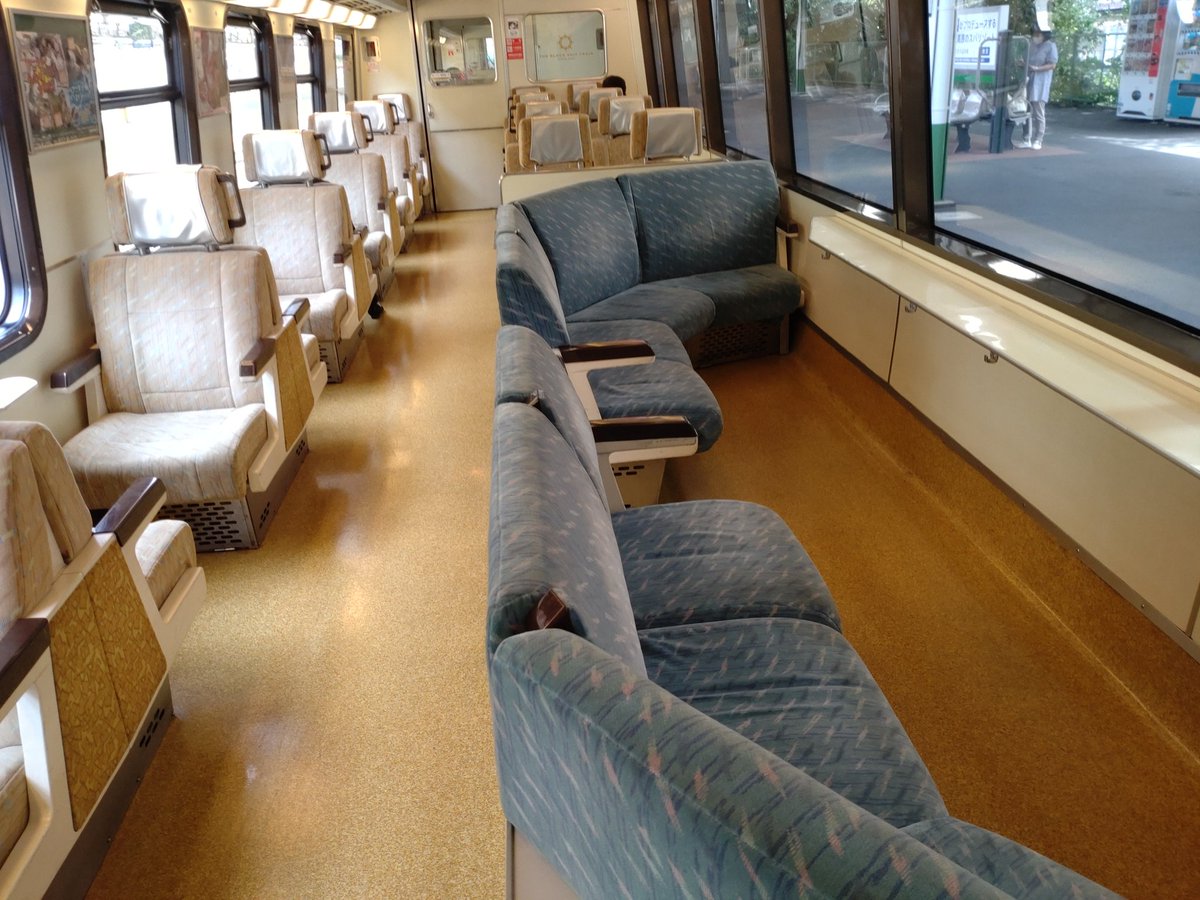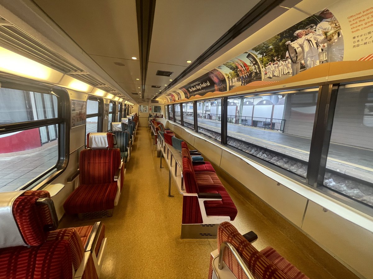 展望を意識した大きな窓と外を向いた座席、先頭車の展望席など豪華な装いですが、少し変色した壁・床やアクリルの注意書きに古さを感じます。