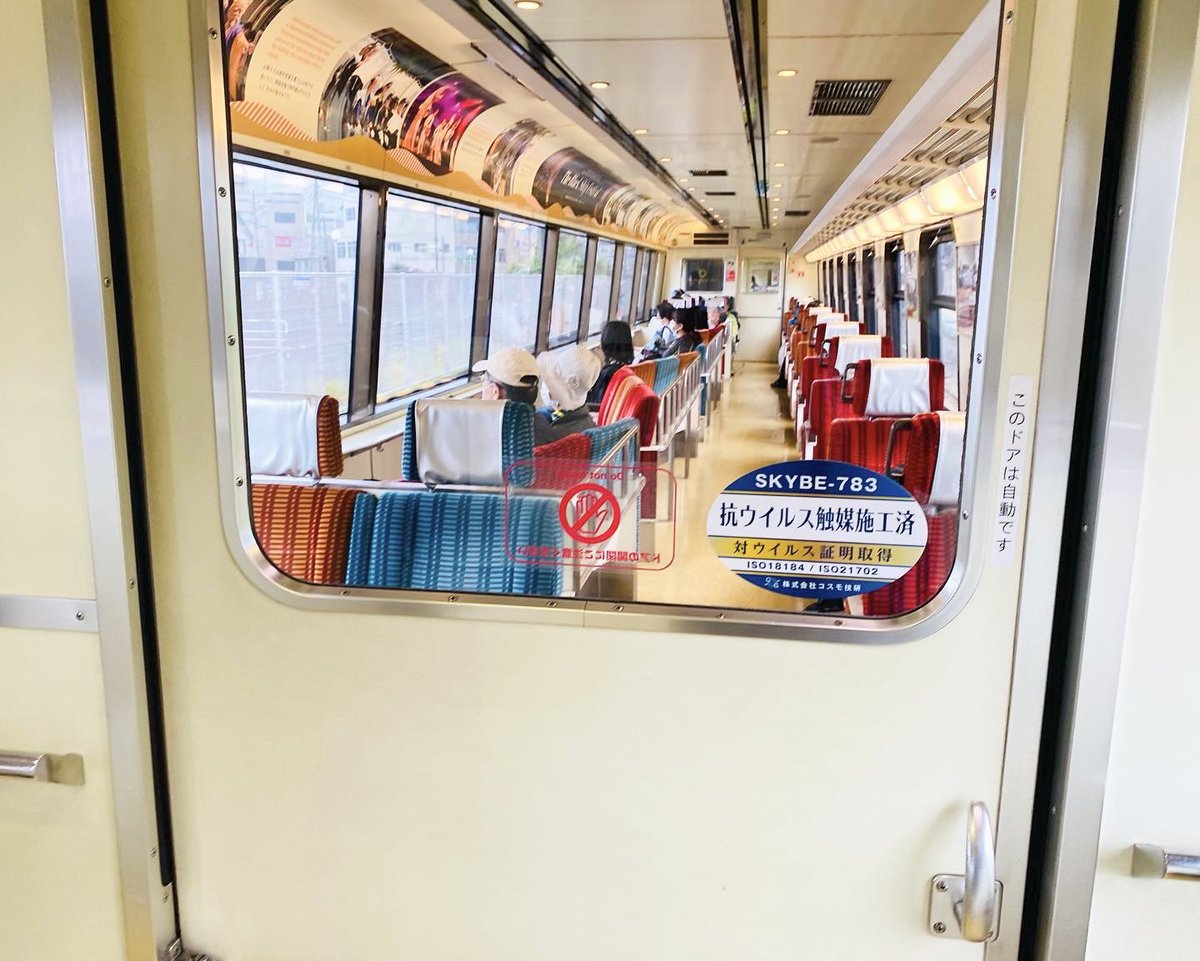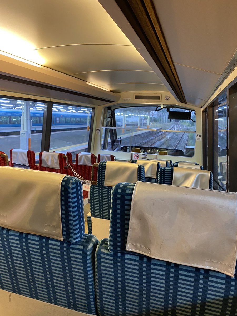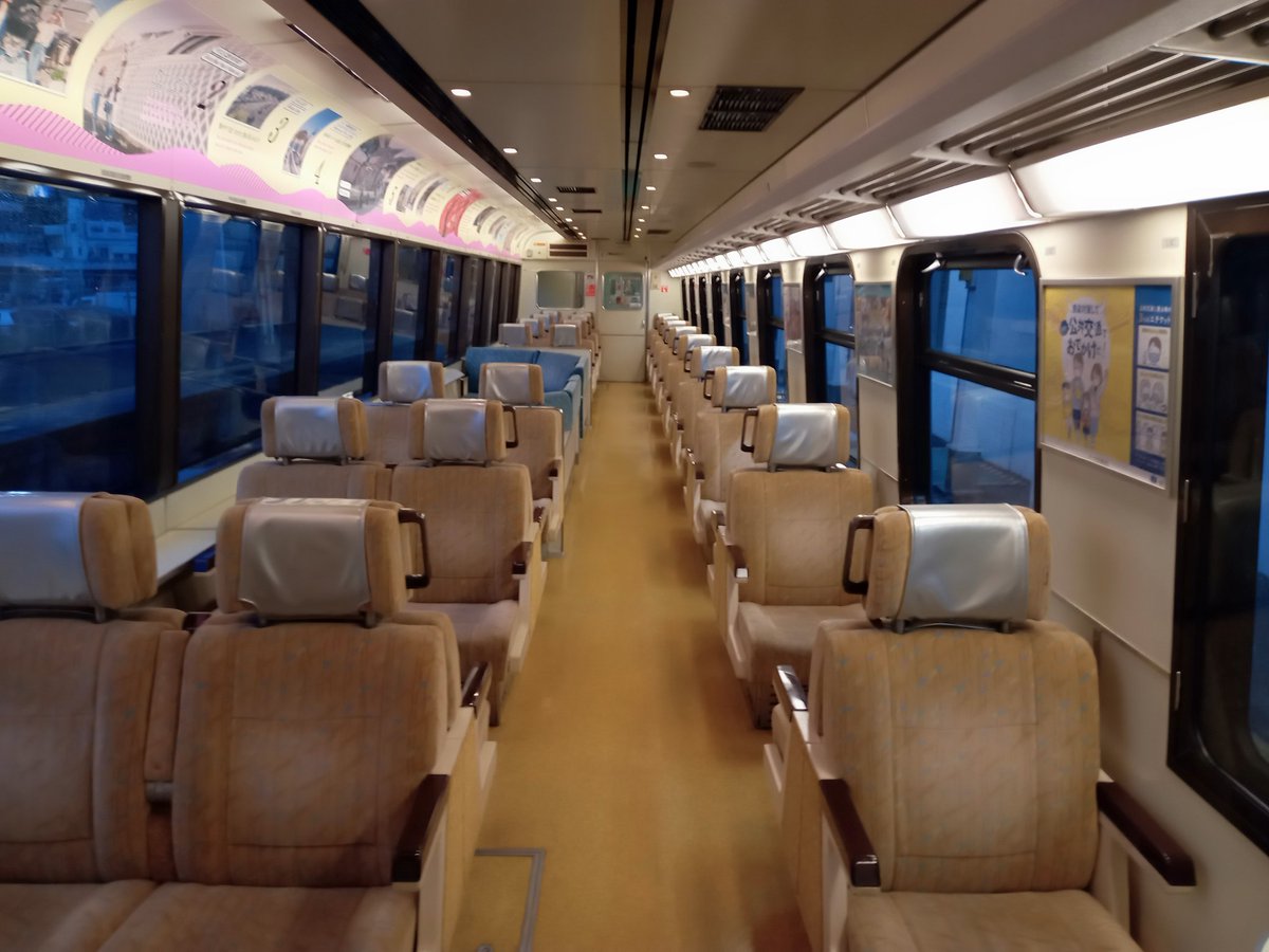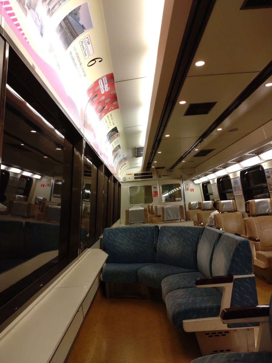 座席の柔らかさや暖色系の内装も相まって、乗っていて心地よく眠れそうな電車でした