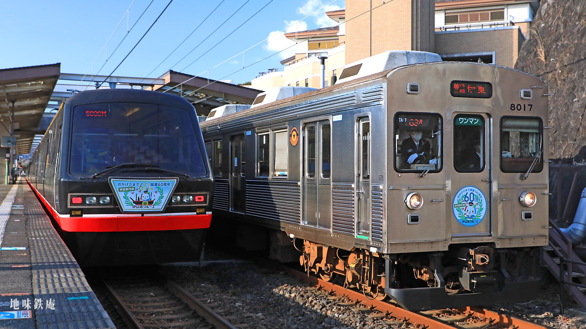試運転発車前には、伊豆急行線開業60周年記念ヘッドマークをつけた黒船電車との並びになりました。