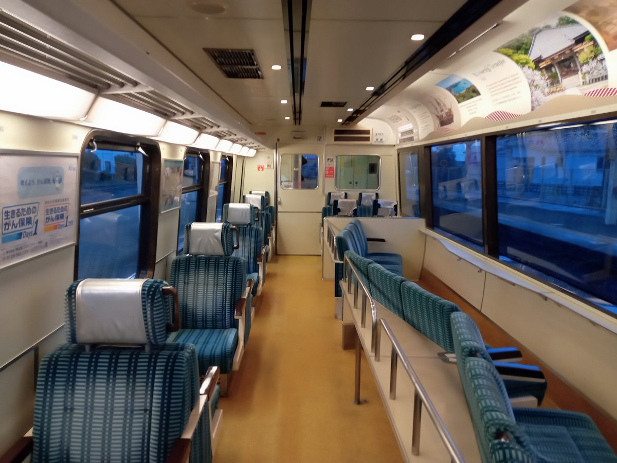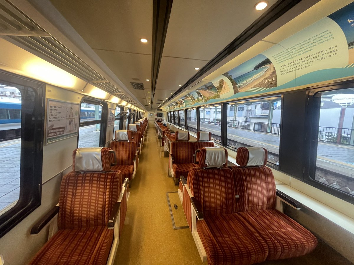 どちらも全席自由席の普通電車で、座席が海側は海向き、山側は向かい合わせです。