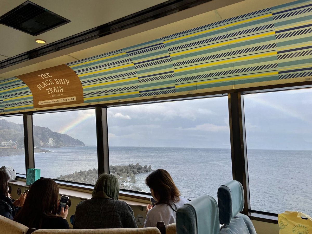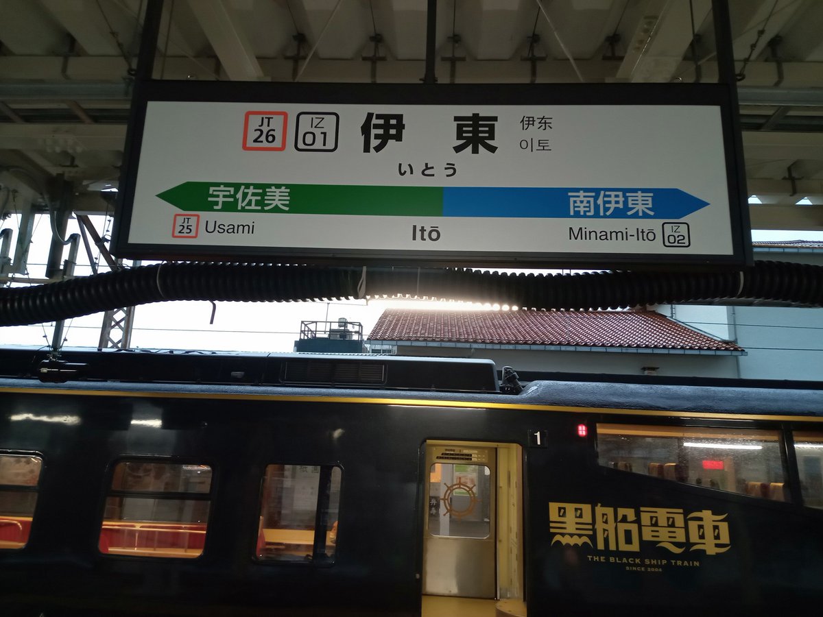 伊東で取材。熱海から伊東行きの電車に乗ろうとしたら、黒塗りの特別仕様の電車!特急?と思ったら普通電車で「黒船電車」と書かれている。車内は海側の席は外に向かって3人掛け、山側は対面2人席。ラウンジ感たっぷりで、しっかり海側に座り旅気分を味わって来ました💕 pic.twitter.com/XKaLNVnizA 2022-06-11 08:29:00